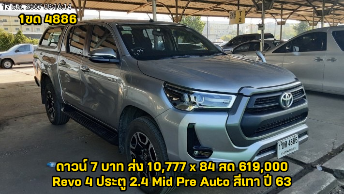 24/10/2025 | Mottoกทม.ถึง 26/5/68 ตรวจแล้ว 29/5/68 พี่หนึ่ง | ดาวน์ 7 บาท ส่ง 10,577x84 สด 599,000 (T.49) ผลต่าง KKP:19500; ผลต่าง KA:70000; ผลต่าง TTB:81000; | 2ขช 6714 กทม | 4 ประตู | TOYOTA Revo 4 ประตู 2.4 High Pre สีเทา ปี64 เกียร์ธรรมดา ข้อมูลการขาย นายวสุ วงศ์ช่วย 082-2027561 ซื้อ 093-1206678 แฟน 082-5838843 ญาติ ดาวน์ 100,000 บาท จัด 485,000 บาท งวด 10,667x72 /CIMB 3,000/แถมป1 sompo//นายหน้า 7,000//ส่วนลด 14,000//ขายเต็ม 1,500//แถม L XL ดำ อย่างละ 1 ตัว , XL แดง 1 ตัว /เซลล์โอ๊ด/สาม(ขอนแก่น) | ขอนแก่น | ขายแล้ว | ส่งเล่มแล้ว | ได้รับแล้ว 20/06/2568 |